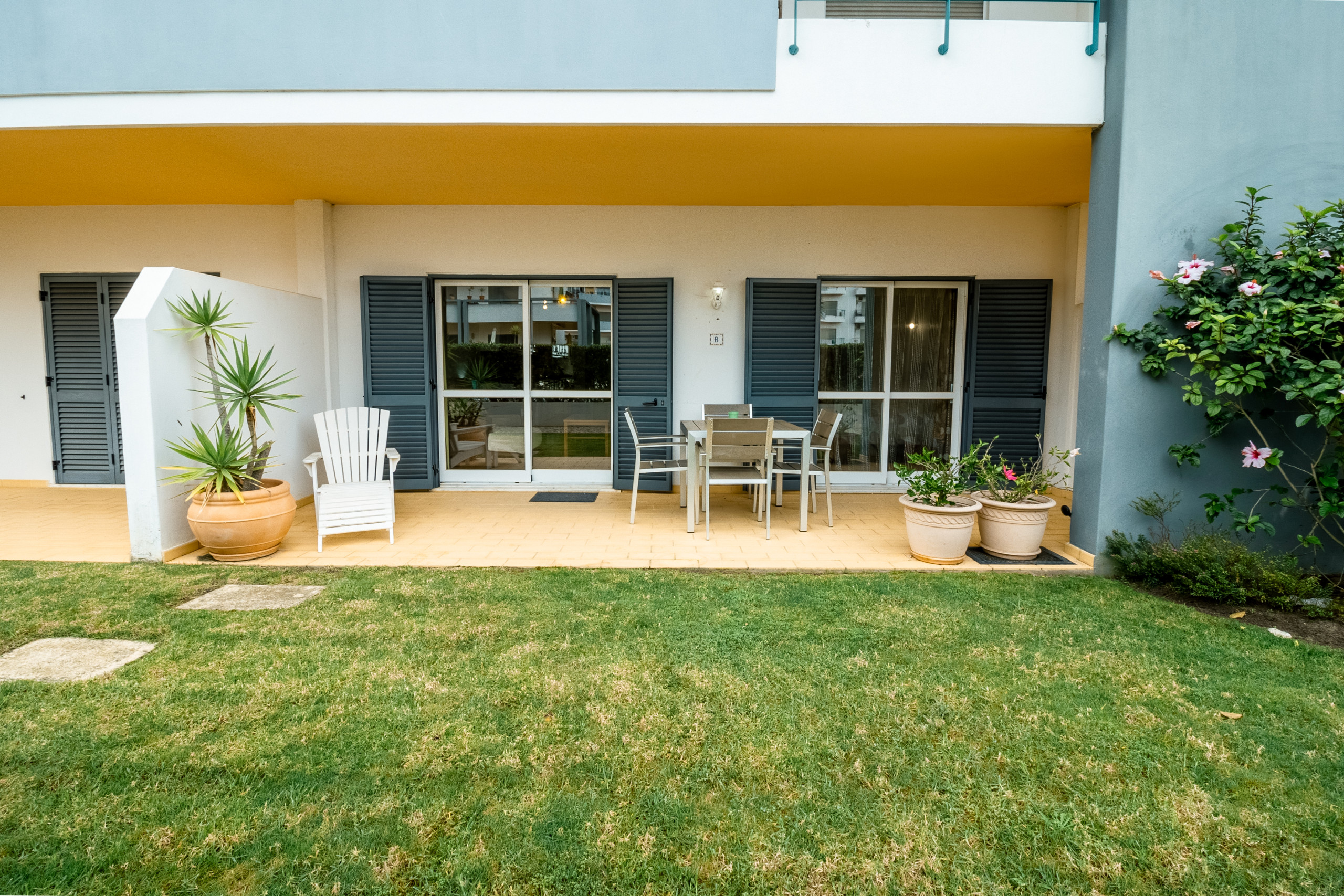 Apartamento luminoso de um quarto com terraço e jardim dentro de um condomínio com piscina.