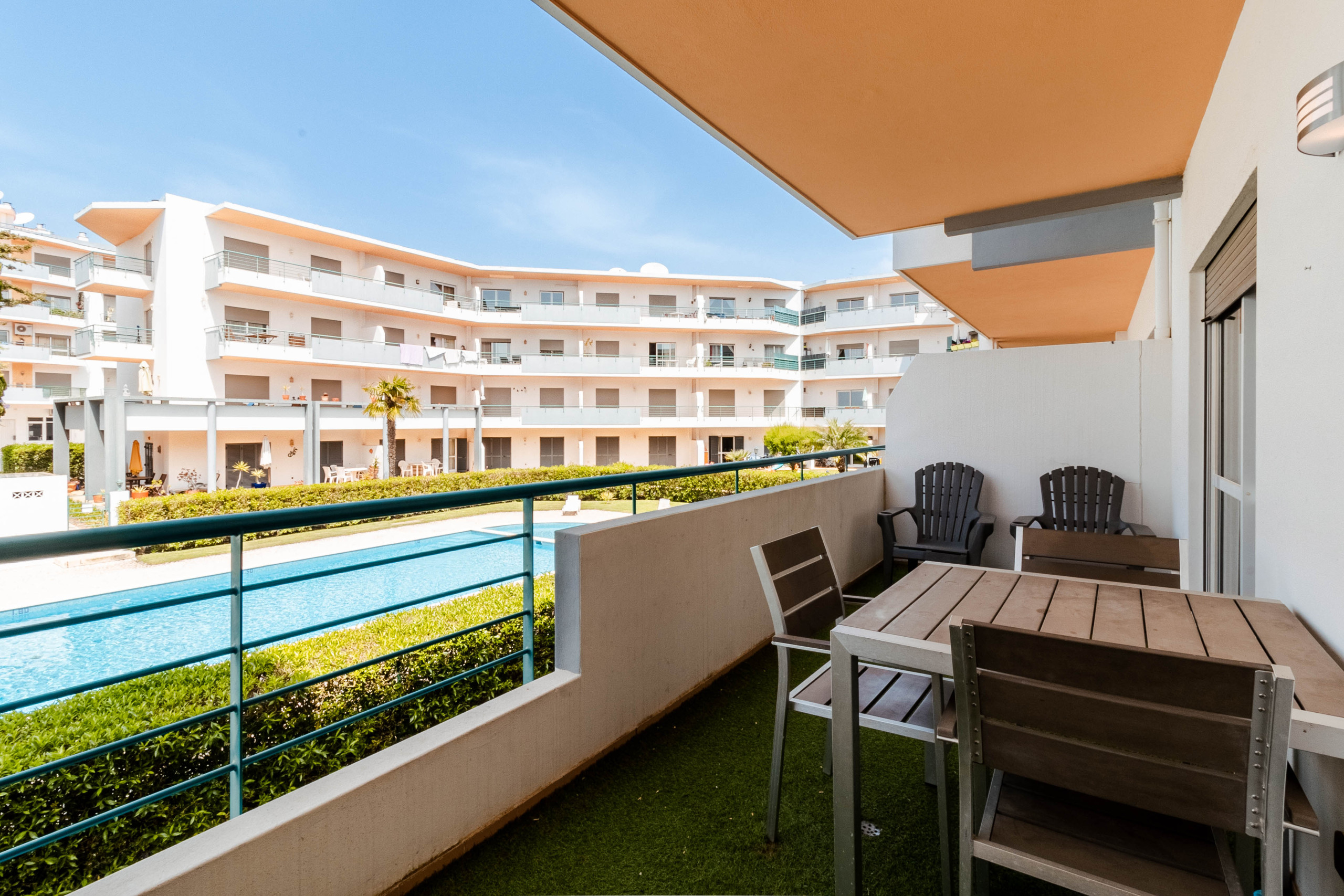Confortável apartamento de um quarto com terraço dentro de um condomínio com piscina.