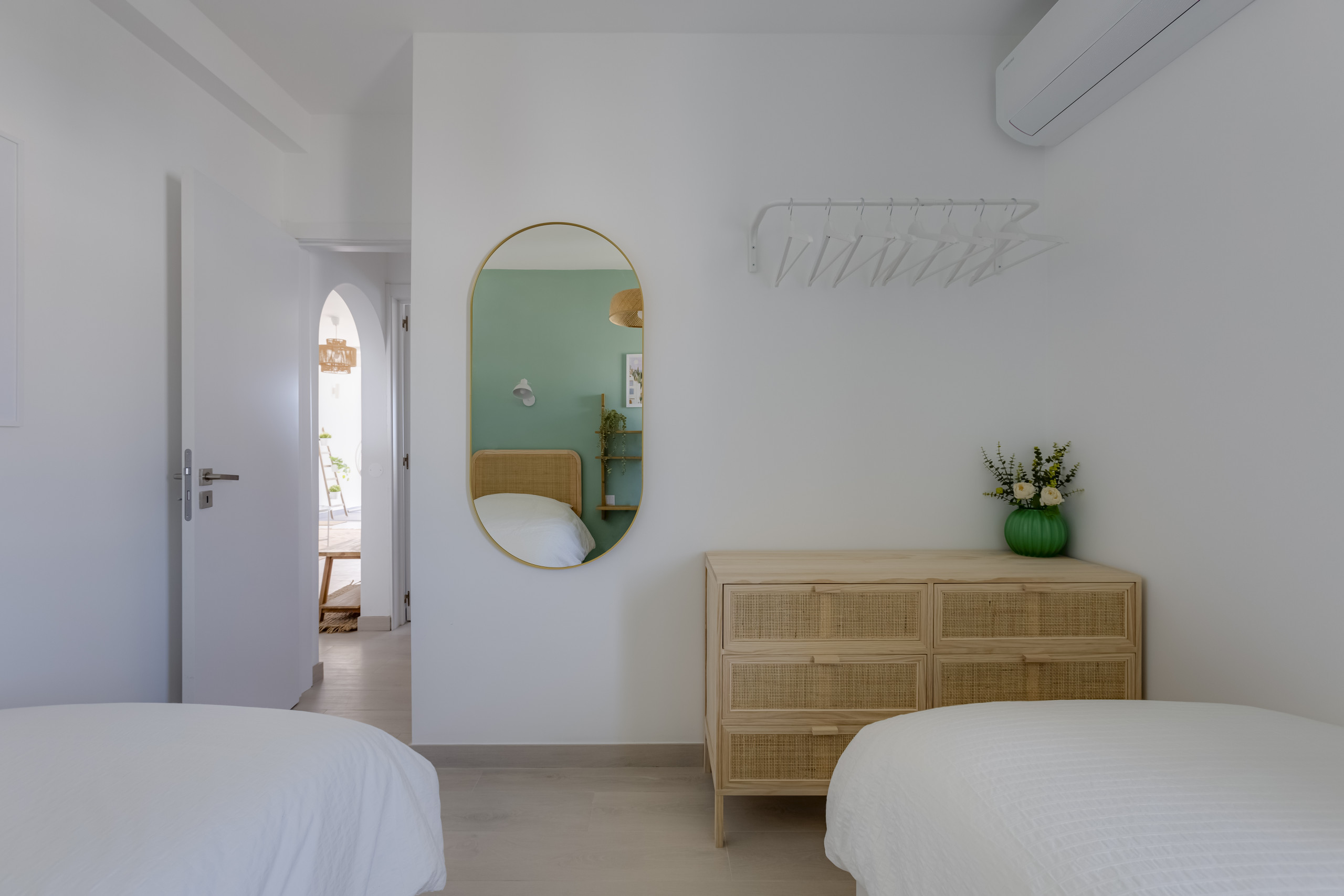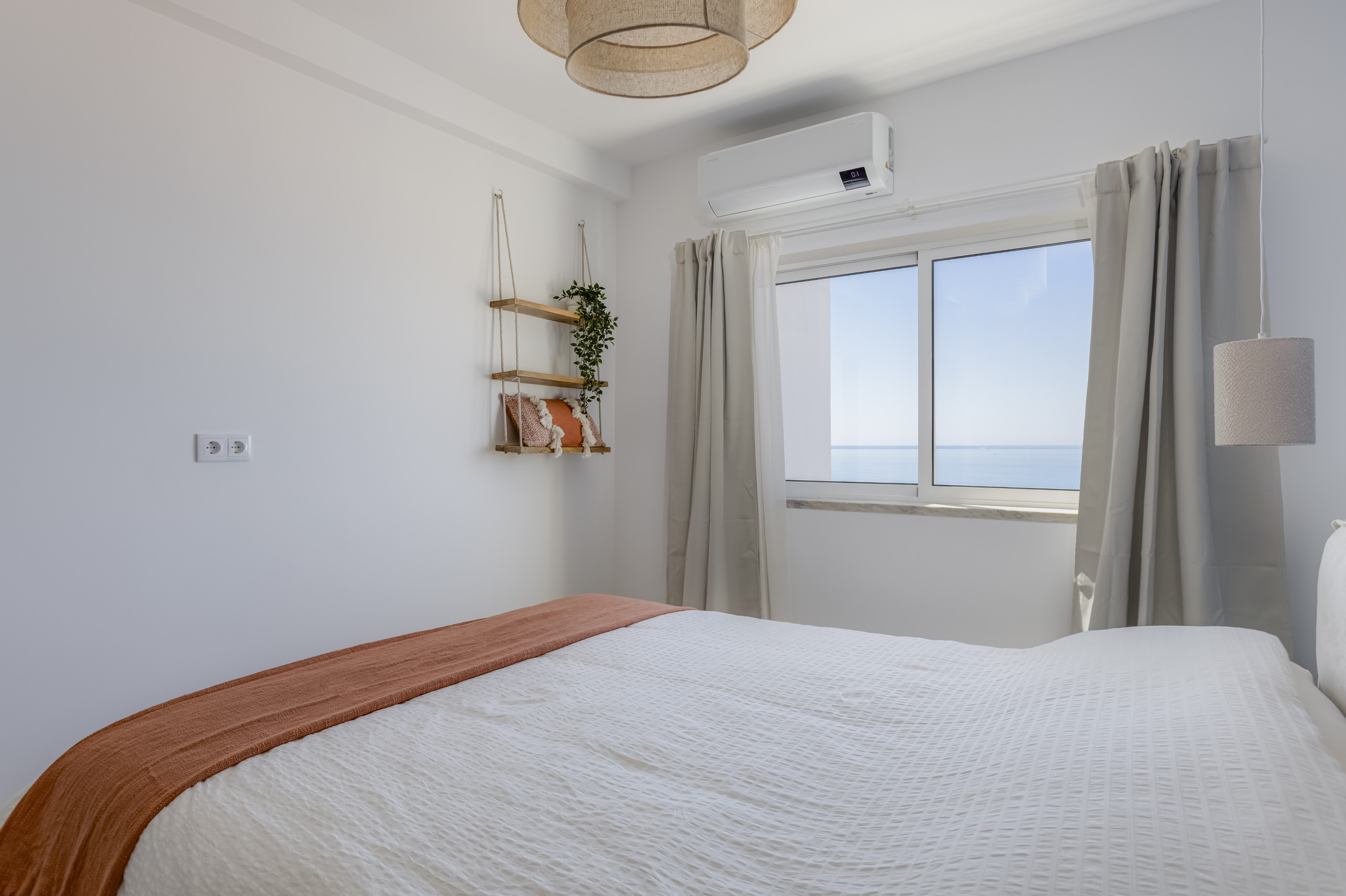 O quarto principal tem uma vista mar incrível, também como uma cama de casal muito confortável e um armário com bastante arrumação. O segundo quarto tem duas camas de solteiro e é bastante luminoso e decorado com gosto. A casa de banho é de estilo moderno, mas com personalidade e tem um amplo walk-in shower. A sala tem muita luz natural e portas de vidro de correr que se abrem quase na totalidade e dão acesso a varanda onde se pode sentir como se estivesse a poucos passos da água. Esta varada com a vista que tem, é o que mais destaca neste apartamento.