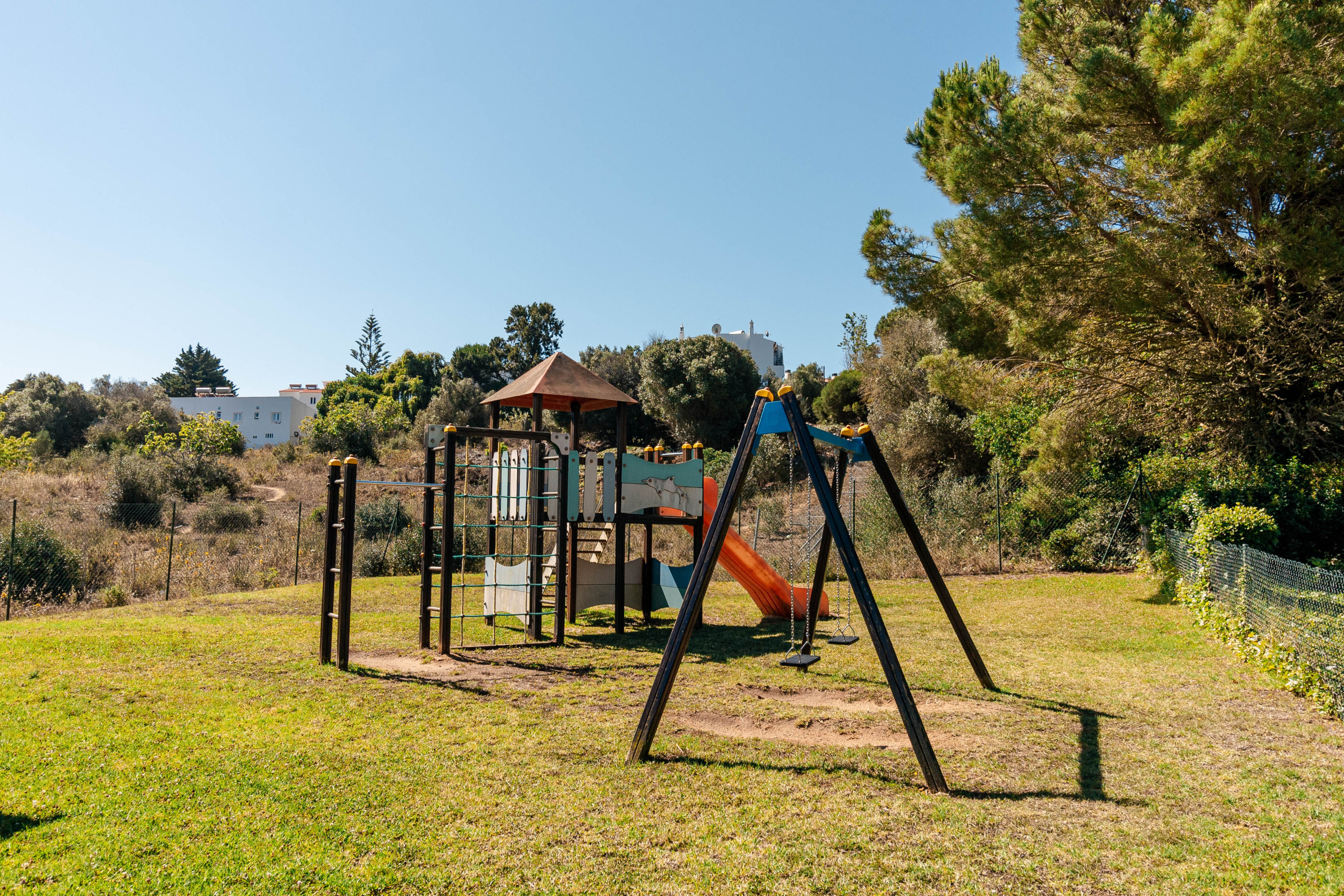 The gardens of this complex are expansive with plenty areas to explore. It benefits of an Olympic size pool, another baby pool, two tennis courts, and a children’s playground which are open all year round. There is also a restaurant in the pool area which opens from April to October.