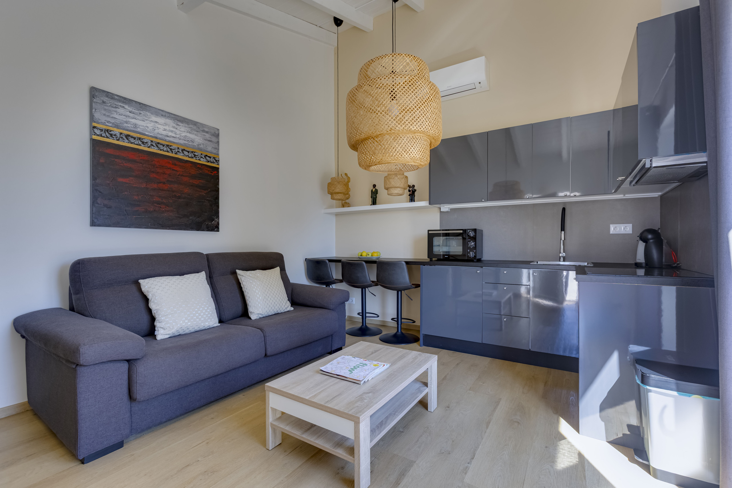Questo accogliente studio indipendente è perfetto per un massimo di tre ospiti. La camera da letto offre un comodo letto matrimoniale e due armadi laterali per i tuoi effetti personali, mentre l’area soggiorno dispone di divano letto e cucina completamente attrezzata con tutti i servizi essenziali. All’esterno, un grazioso terrazzo permette di gustare il caffè del mattino al sole.